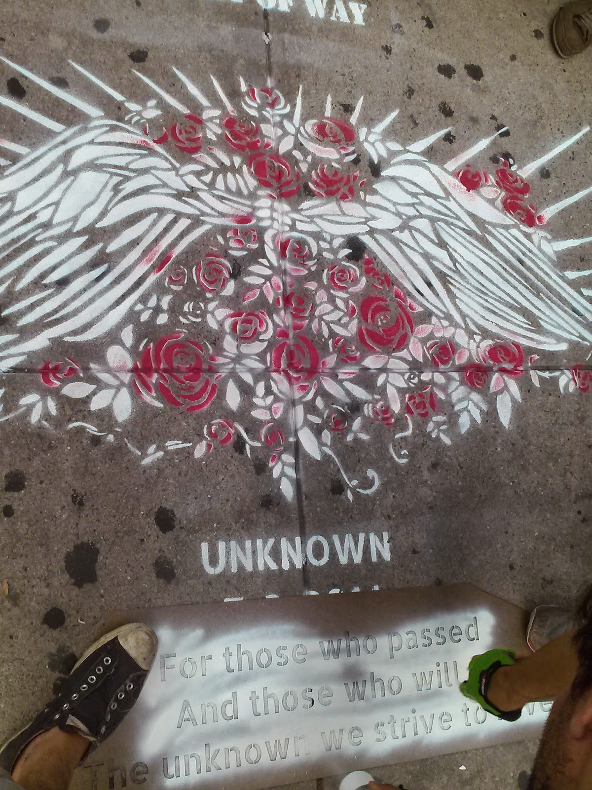 This “Ride of Remembrance and Hope” was a sequel to the inaugural ride in which Right of Way installed memorials for Families for Safe Streets on August 3rd, 2014. At each site, an image of wings, flowers and rays of light emerging from ashes was spray-painted onto the sidewalk or street where the victim was killed, along with the person’s name, the date she or he was fatally struck, and a commemorative phrase written by the family.