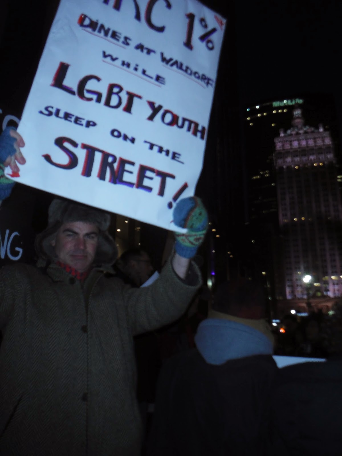 | Photos and caption by Jamie Leo A few images from tonight's @ACTUPNY protest outside of a lavish @HRC gala at @WaldorfNYC. Speaking up for ignored, #homeless,#atrisk #LGBT youth. |