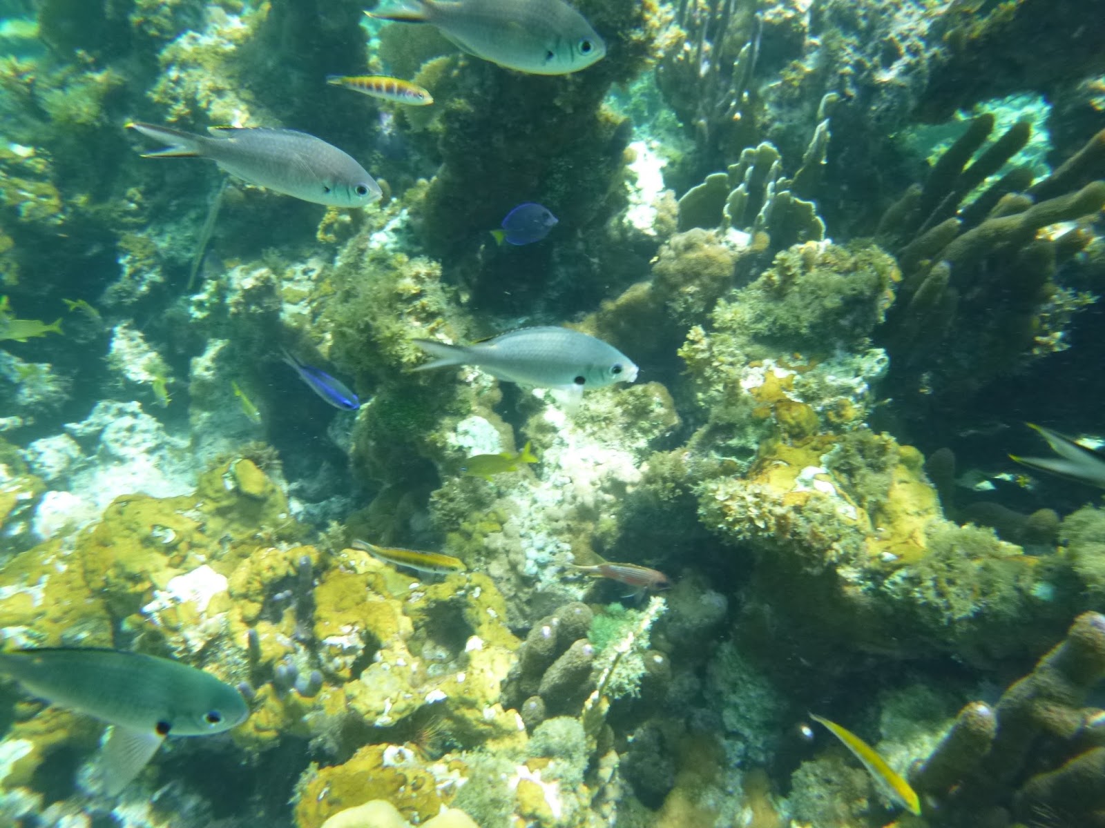 They take us on a boat to the local coral reefs. The water is only six to ten feet deep in some places. Yet, the fish are everywhere, joining us as we swim.