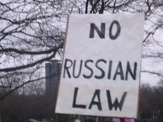 Standing with a group of Georgian and Ukrainian activists, activists are speaking out about the law. “It negates free speech,” says one man with a megaphone. “It happened in Russian. Now they don’t have free speech. “Don’t eat yellow snow,” says Nicholas. Everyone said it, referring to the old Frank Zappa song about a man who has a dream he’s become an Eskimo. He tells his mother. "Watch out where the huskies go,” she says to him, with a word of caution. “Don't you eat that yellow snow." In other words, stay clear of Russia.